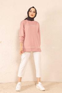 Lamelif Kapşonlu Oversize Yan Cepli Sweat Pudra