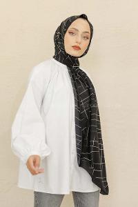 Modalamelif Siyah&Beyaz Baskılı Medine İpeği Şal Çizgi Desen