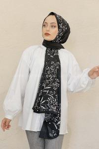 Modalamelif Siyah&Beyaz Baskılı Medine İpeği Şal Dal Desen