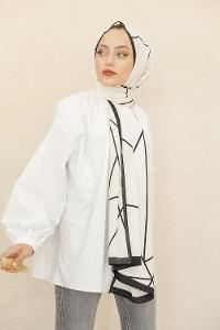 Modalamelif Siyah&Beyaz Baskılı Medine İpeği Şal Toana Desen