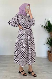 Modalamelif Soyut Desen Kol Lastikli Elbise Lila