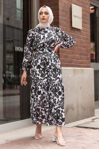 Lamelif Balon Kol Katlı Tesettür Elbise Siyah