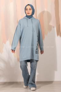 Lamelif Kapşonlu Oversize Yan Cepli Sweat Saks Mavi