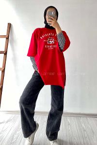 Modalamelif Superior Yazılı Yan Yırtmaçlı Oversize T-Shirt Kırmızı