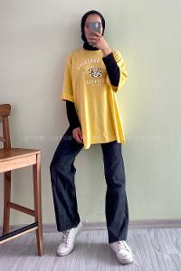 Modalamelif Superior Yazılı Yan Yırtmaçlı Oversize T-Shirt Sarı
