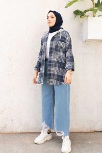 ön düğmeli, ekose desen parça penye garnili gömlek