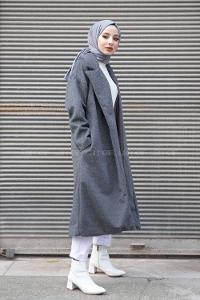 Modalamelif Kuşak Bağlama Detaylı Kaşe Kaban Gri