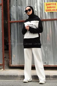 Lamelif Kolu Çizgi Detaylı Kapüşonlu Sweat Ekru