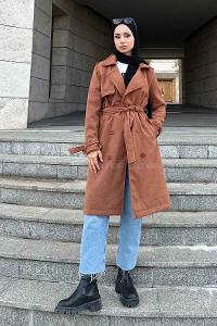 Lamelif Kuşak Bağlama Detaylı Kaşe Kaban Acı Kahve