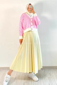 Modalamelif V Yaka Boydan Düğmeli Kare Desen Triko Hırka Pembe