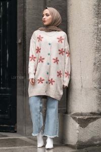 Modalamelif V Yaka Boydan Düğmeli Papatya Desen Hırka Bej