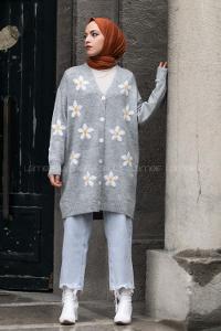 Modalamelif V Yaka Boydan Düğmeli Papatya Desen Hırka Gri