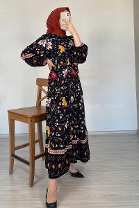 Modalamelif V Yaka Çiçek Desenli Elbise Siyah