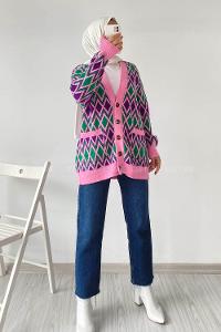 Modalamelif V Yaka Çift Cepli Önü Düğmeli Etnik Desen Triko Hırka Lila