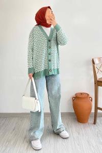 Modalamelif V Yaka Düğmeli Desenli Triko Hırka Çağla Yeşili