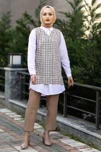v yaka ekose desen kuşaklı yırtmaçlı süveter