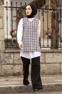 v yaka ekose desen kuşaklı yırtmaçlı süveter