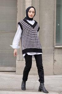 Modalamelif V Yaka Kazayağı Desen Triko Süveter Siyah