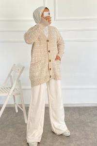 Modalamelif V Yaka Önü Boydan Düğmeli Çift CepliTriko Hırka Taş