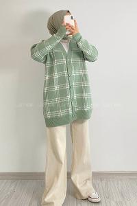 Modalamelif V Yaka Önü Boydan Düğmeli Ekose Desen Triko Hırka Çağla Yeşili