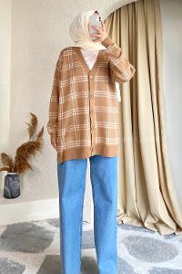 Modalamelif V Yaka Önü Boydan Düğmeli Ekose Desen Triko Hırka Sütlükahve