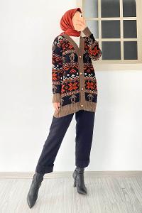 Modalamelif V Yaka Önü Düğmeli Etnik Desen Triko Hırka Siyah-Kahverengi