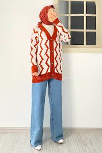 Modalamelif V Yaka Önü Düğmeli Etnik Desen Triko Hırka Taba