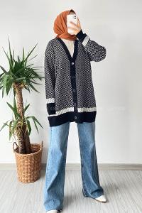 Modalamelif V Yaka Önü Düğmeli Mini Kare Desenli Hırka Siyah