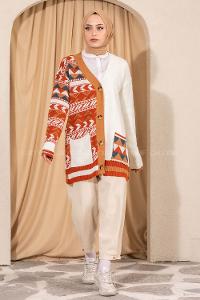 Modalamelif V Yaka Önü Düğmeli Renk Garnili Etnik Desen Triko Hırka Ekru