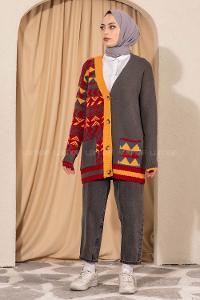 Modalamelif V Yaka Önü Düğmeli Renk Garnili Etnik Desen Triko Hırka Füme
