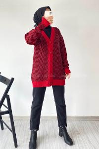 Modalamelif V Yaka Önü Düğmeli Şerit Desenli Hırka Kırmızı