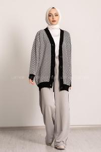 Lamelif Madalyon Düğmeli Çizgili Triko Hırka Siyah