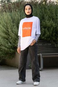 Modalamelif Vellbeing Yazı Baskılı Oversize T-Shirt Turuncu-Beyaz