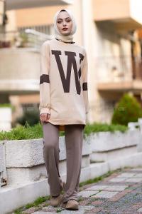 Modalamelif W Baskılı Kol Şerit Sweat Tunik Krem