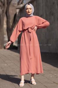 Lamelif Bel Büzgülü Tesettür Elbise Pembe
