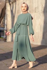 Lamelif Ön Yarım Düğme Detaylı Müslin Kumaş Tesettür Elbise Açık Yeşil