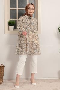 Modalamelif Yaka Bağlamalı Çiçek Desen Tunik Bej
