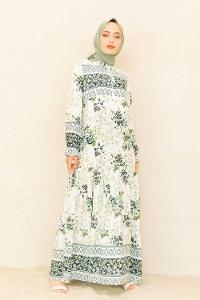 Modalamelif Yaka Bağlamalı Kilim Desen Elbise Yeşil