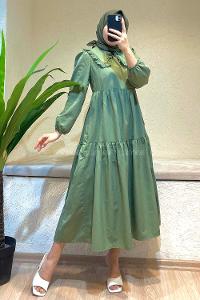 Lamelif Ön Yarım Düğme Detaylı Müslin Kumaş Tesettür Elbise Açık Yeşil