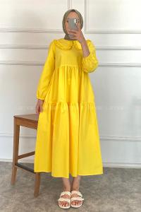 Lamelif Balon Kol Katlı Tesettür Elbise Sarı