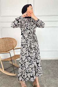 Modalamelif Yaka Fırfırlı Çiçek Desenli Elbise Siyah