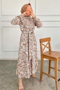 Modalamelif Yaka Fırfırlı Çiçek Desenli Elbise Sütlü Kahve