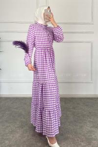 Modalamelif Yaka Fırfırlı Ekose Elbise Lila