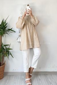 Modalamelif Yaka Fırfırlı Ekose Tunik Sütlü Kahve