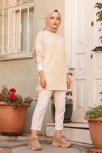 Modalamelif Yaka Nakışlı Çizgili Sweat Hardal Sarısı