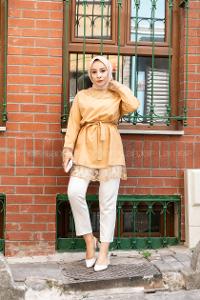 Modalamelif Yaka Ve Etek Dantel Detaylı Kuşak Bağlamalı Tunik Camel