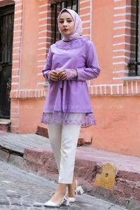 Modalamelif Yaka Ve Etek Dantel Detaylı Kuşak Bağlamalı Tunik Mor