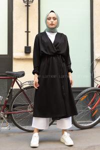 Lamelif Kol Lastikli Düğmeli Trençkot Siyah
