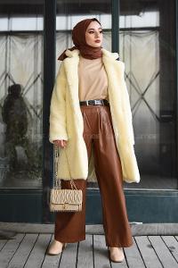 Modalamelif Yan Cepli Uzun Peluş Mont Ekru