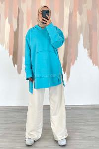 Modalamelif Yanı Düğme Detaylı Oversize Sweatshirt Turkuaz